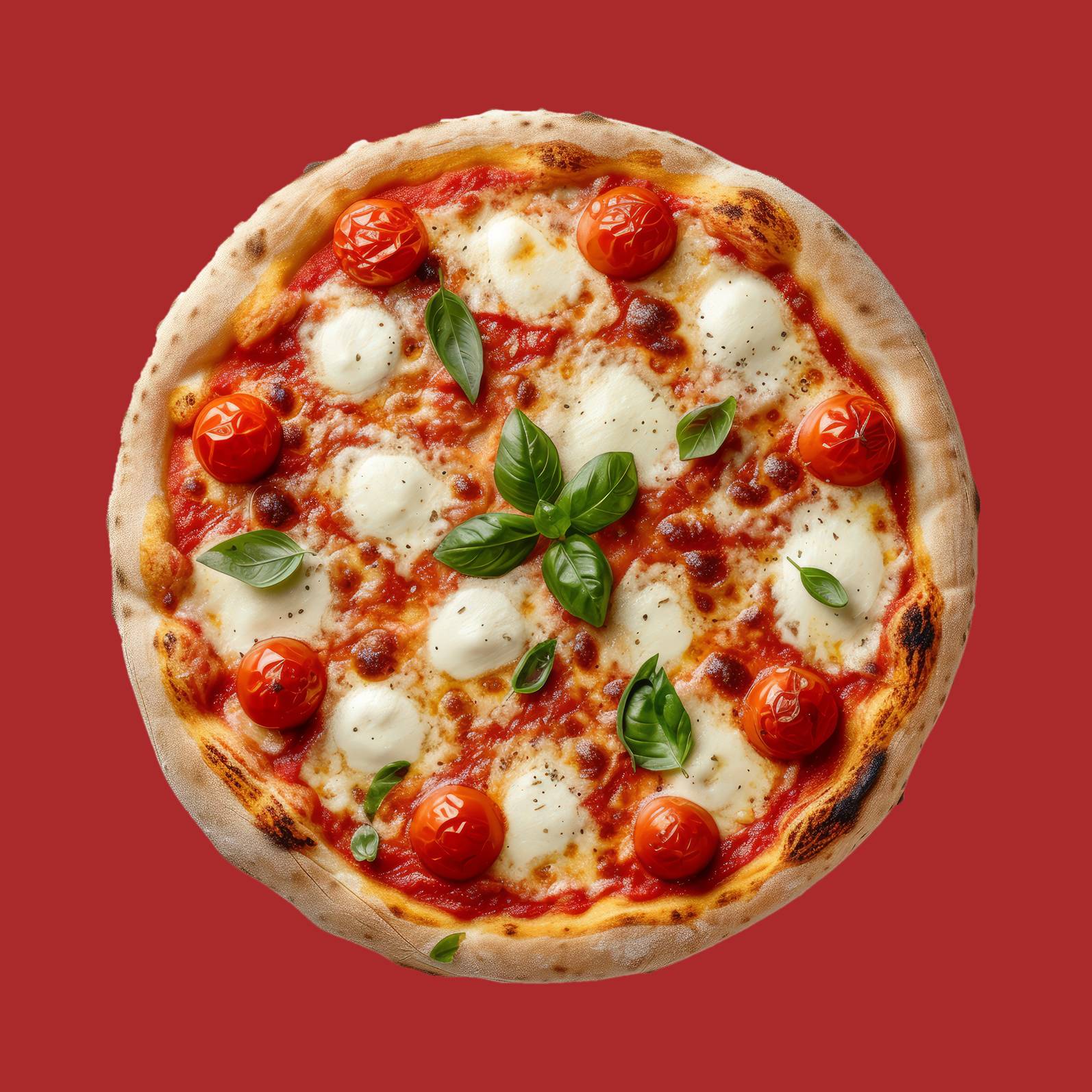 Base tomate, mozzarella, tomates cerises, jambon cru et bufala