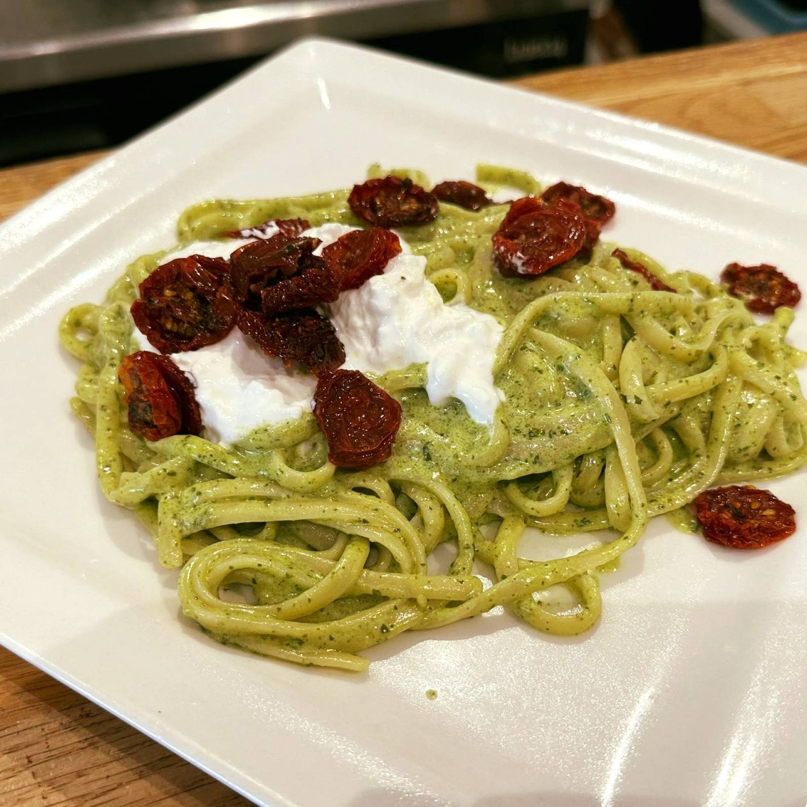 Pesto de roquette, tomates cerises, pignons de pin et burrata